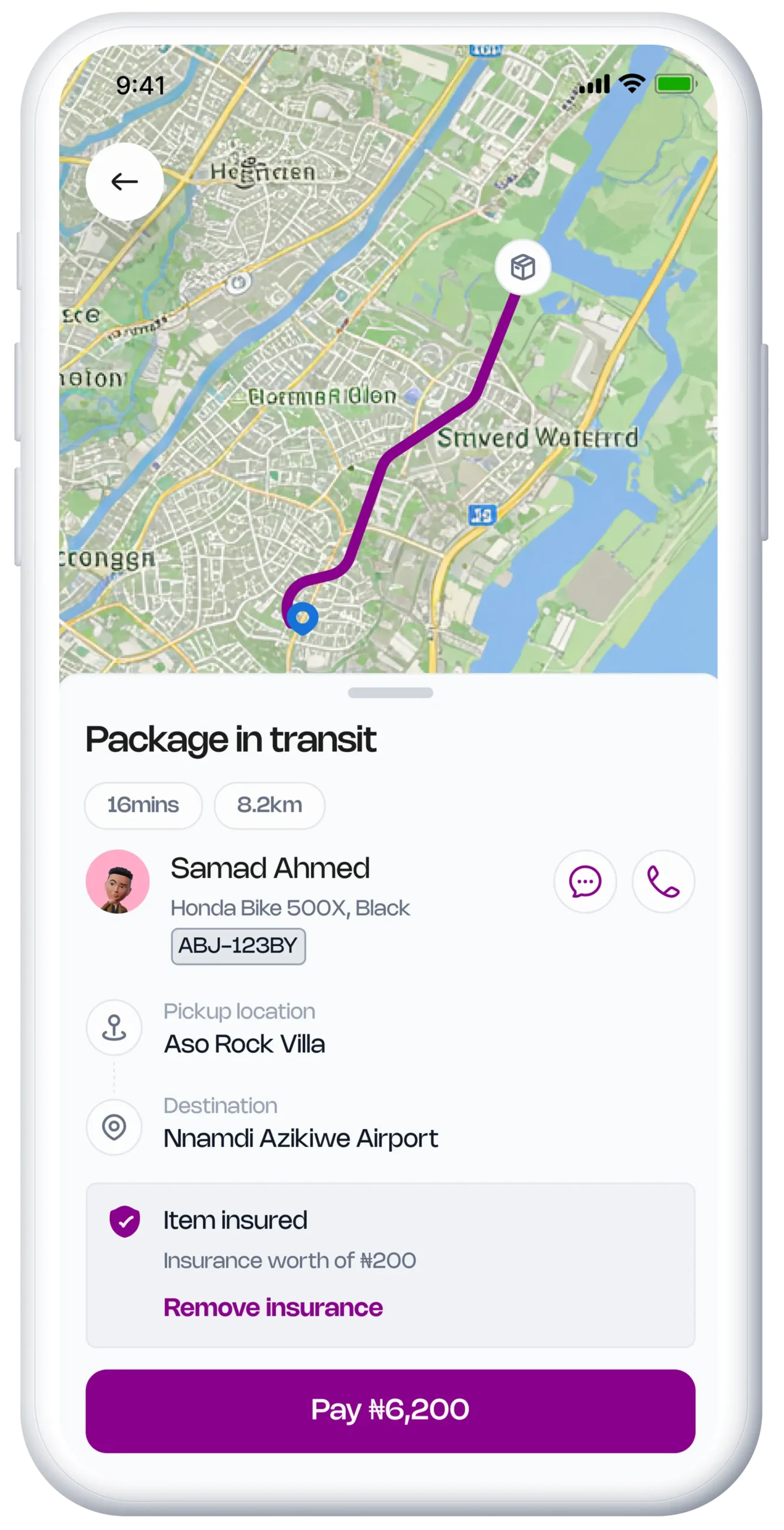 Enter your delivery and package details, negotiate fare, choose rider, and send your package with ease.